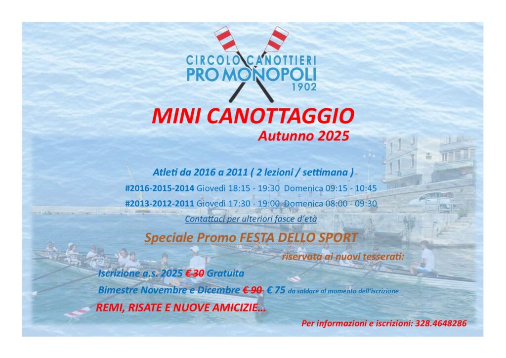 Agonismo Pro Monopoli Corsi Giovanili Autunno 2025 Da Segreteria 8 Novembre 2025 8 Novembre 2025 Campionati Italiani di Fondo a Pisa: prove impegnative per il Circolo Canottieri Pro Monopoli Pro Monopoli Corsi Master Autunno 2025